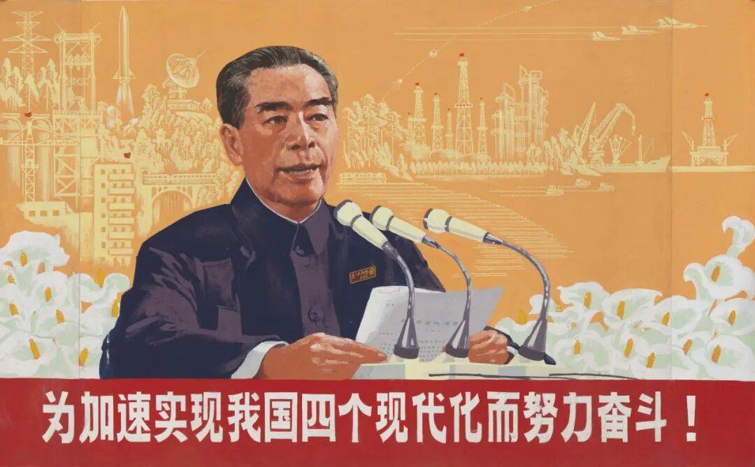 画面以周恩来总理作政府工作报告的形象为主体:他身着中山装,神情从容,目光向前,左胸前佩戴“为人民服务”与毛主席头像胸章。人物两侧布满白色马蹄莲,象征对周总理的敬意与永恒的怀念。背景中密集的卫星发射塔、火箭、铁路、高架电缆、吊车、飞机、轮船、石油勘探等符号,构成高度概括的“现代化”图景,强调工业、交通、能源与科技等领域的整体推进。除去标语口号部分,画面以大面积鲜亮的橙色为主调,强化一种向前发展的视觉指向。宣传画下方以红底白字排列标语“为加速实现我国四个现代化而努力奋斗!”,字体以黑体为基础,但笔势更具弹性和动势,使口号在醒目之外呈现一定的节奏感和向上的调性。整体上,作者将人物形象、代表性符号与主题标语组合在同一画面中,体现了特定年代宣传画的视觉策略,为我们理解当时国家发展叙事如何通过图像进入公共空间提供了线索。