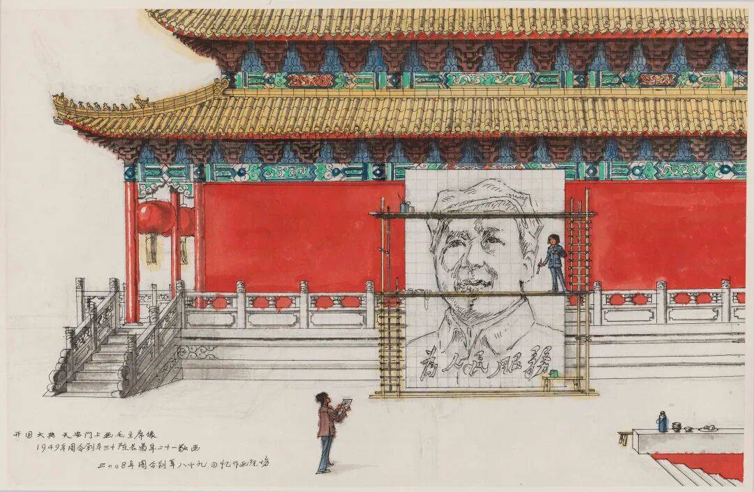 画面以城楼东侧红墙为远景,中景是,整体形体已基本完成。画像周围临时搭建两层脚手架,左右各设攀爬梯,结构简洁,功能齐全,符合高强度、限时完成的制作需求。陈若菊站在二层作业,右手执笔、左手持调色碗;前景中间的周令钊手拿一张小稿,似在与陈若菊沟通绘制细节。右侧台阶上摆放的暖壶、板凳、碗与盘中馒头等生活物件,提示了现场的工作节奏与临时条件。这个作品采用针管笔与水粉相结合的方式,建筑细部描绘严谨,色彩和谐,在纪实性的描绘中将观者带回开国大典筹备阶段的具体工作场景。