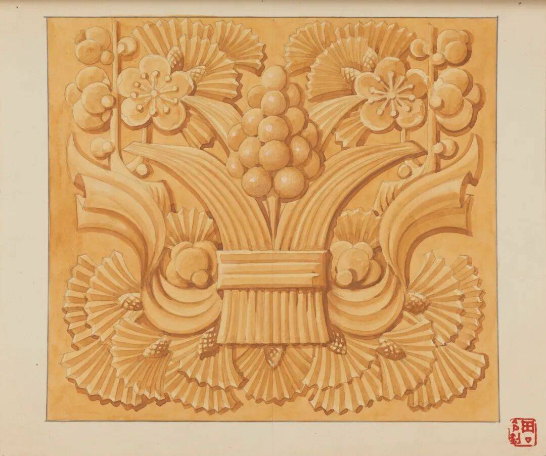 在形式语言上,图案延续了周令钊将传统装饰艺术与现代设计方法结合的特点:植物与绶带等元素取法于传统吉祥纹样,但通过更规整的构图组织与浮雕式的体量处理,使其适应建筑装饰对尺度、秩序与可实施性的要求,呈现“民族化+现代化”的创作路径。作为纪念性建筑的重要组成部分,此类装饰图案不仅服务于空间气质的营造,也承载公众对历史人物的情感表达与纪念意义。