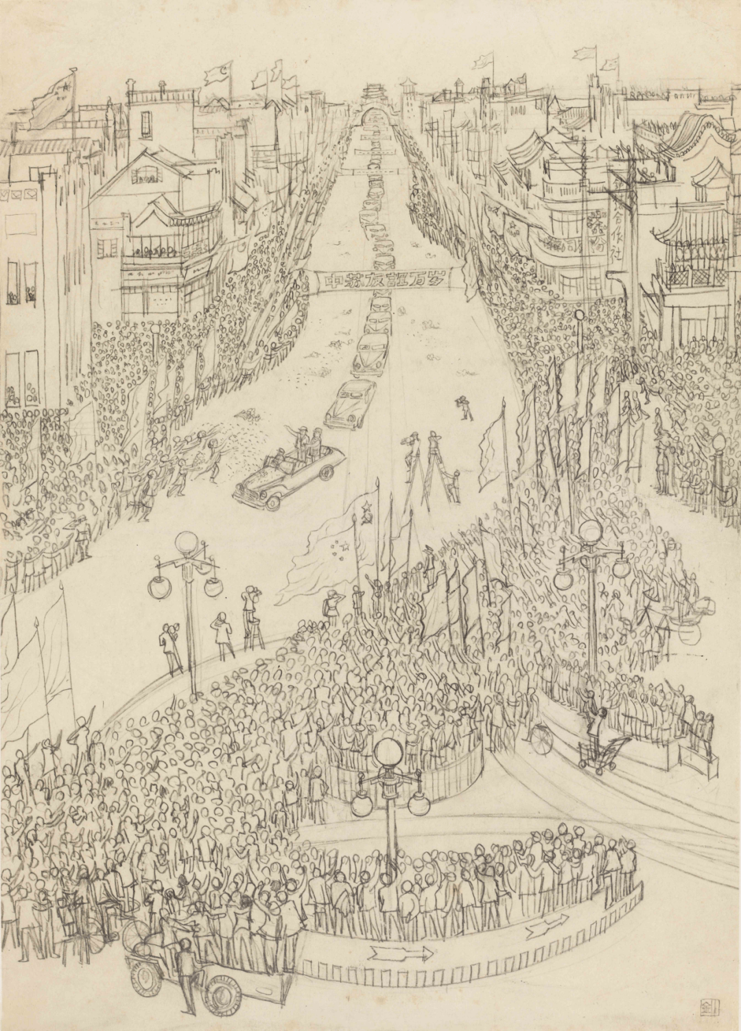 创作于 1957年的《中苏友谊万岁》是一件为报纸定制的速写作品,发表于《人民日报》1957年4月16日第2版,作品描绘了主席亲自迎接来华访问的苏联最高苏维埃主席克·叶·伏罗希洛夫元帅及代表团时首都群众夹道欢迎的场景。