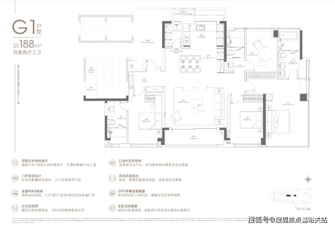 188户型2梯2户,有独立的电梯厅。4房3卫设计,还是3明卫,这两点还是不错的。