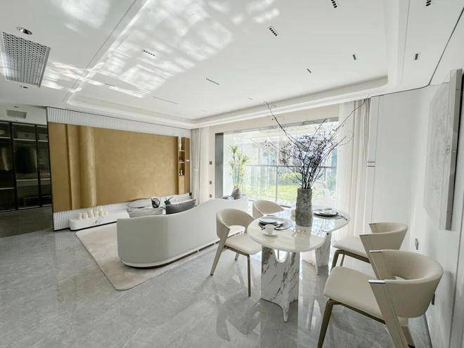 。通过整合餐客厨等公共区域厅,将原来南北厅中间的走廊空间融合到使用空间中,减少过道的面积,避免碎片化的空间带来的冗余浪费。大面宽,短进深,餐厅与客厅横向相连,每一平方米都物尽其用,把客厅升级为家庭互动主场。