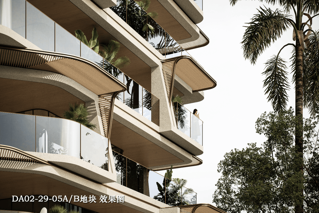 延续了三亚豪宅超高墙窗比,甲板型阳台的设计语言,根据效果图光泽来看,大概率是全体系铝板外立面。