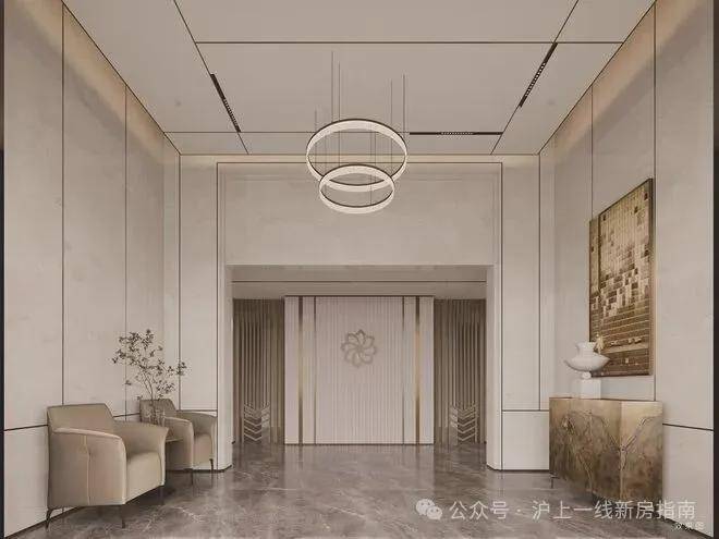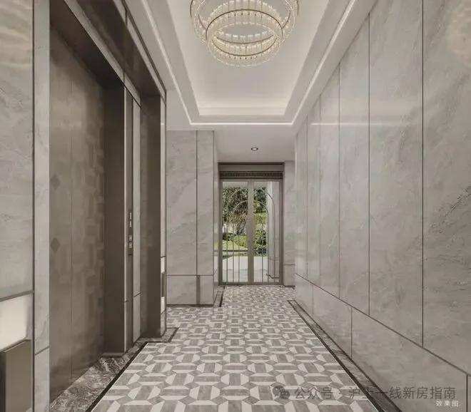 品质感拉满。首层入户大堂,石材搭配金属装饰条的地面、墙面,空间宽敞气派,质感十足。